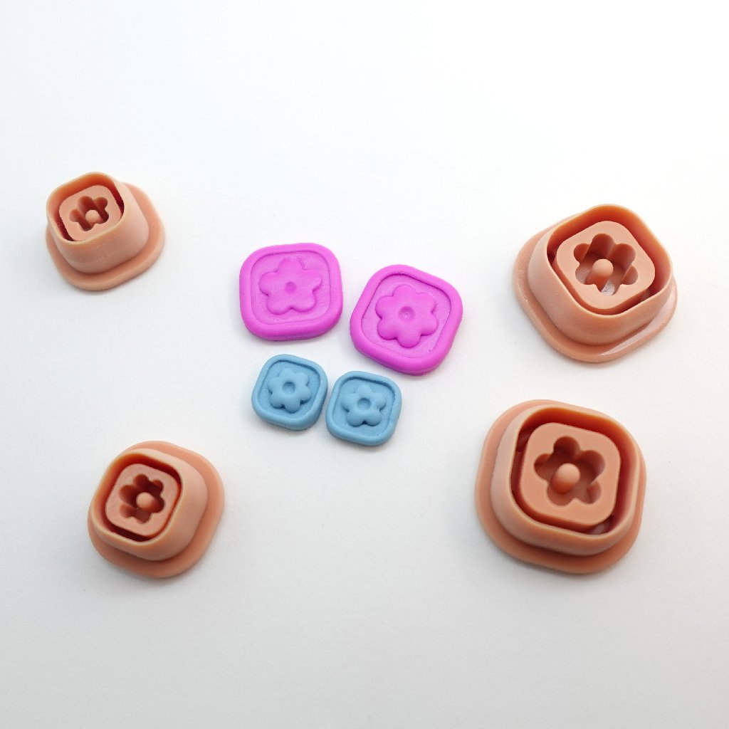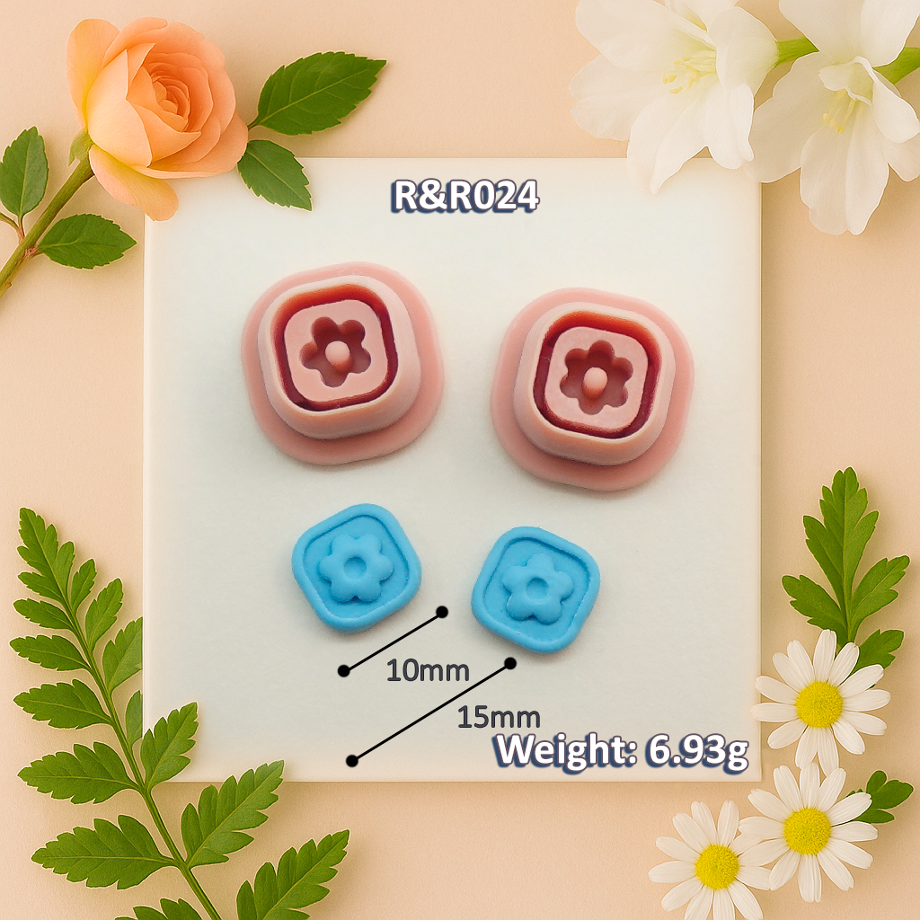 This adorable clay cutter set features a rounded square frame with a cut-out flower center — perfect for playful and layered earring designs. Includes two sizes (10mm and 15mm) and 2 types of flowers (5 Petals and 6 Petals)